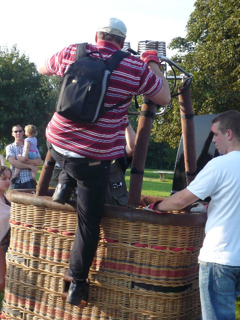 Die Ballonhülle steht in der richtigen Position, der Korb wird nun gemeinschaftlich niedergedrückt. |